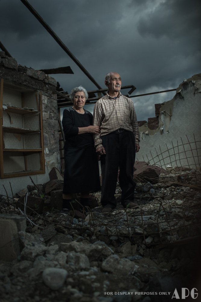 Haikanoush and her husband on the remains of their house.